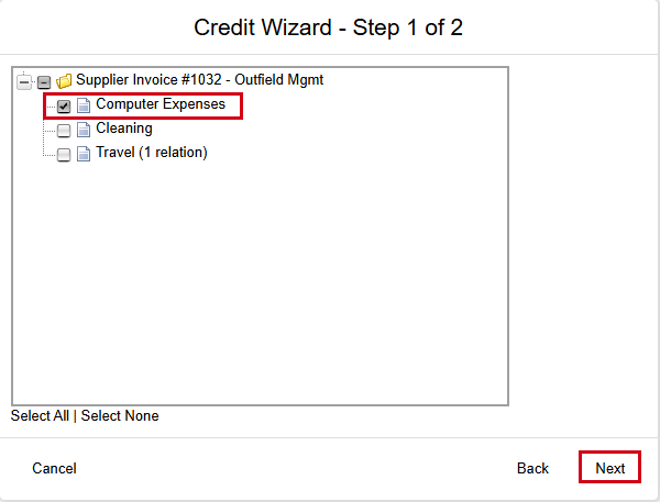 - Select the items you want to include in the credit and click Next.