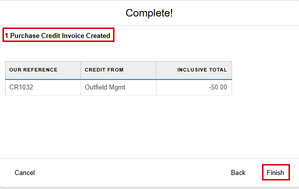 - Click Finish again. The draft credit supplier invoice is displayed.TIP: The supplier invoice and the purchase credit invoice look very similar and function in the same way. To help you differentiate which type of invoice you are viewing, note that a supplier invoice uses a yellow background color and a purchase credit invoice uses a green background color. Additionally, a purchase template uses a grey background.