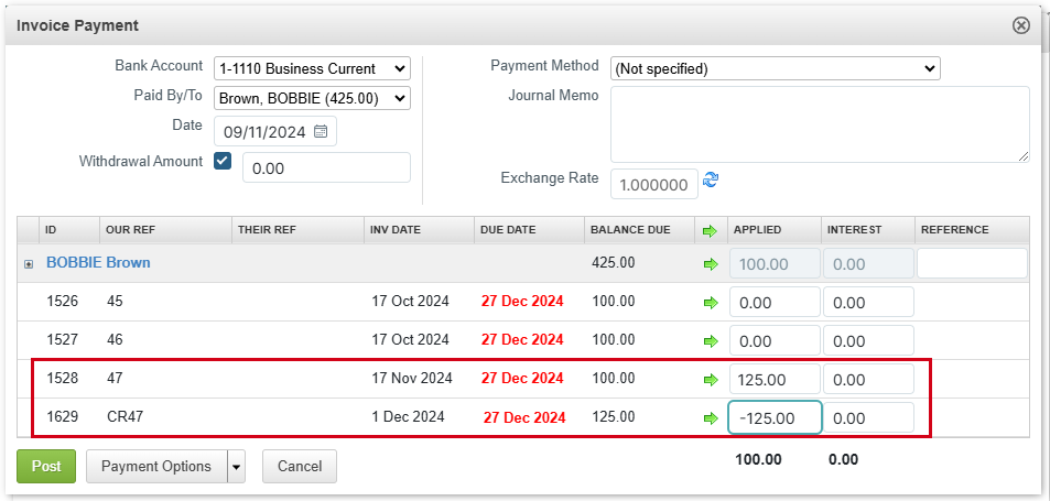 NOTE: The two amounts should cancel each other out so that the total applied and the Withdrawal Amount are both zero. You can apply a credit to more than one invoice using the above method. - Click Post to post the transaction.