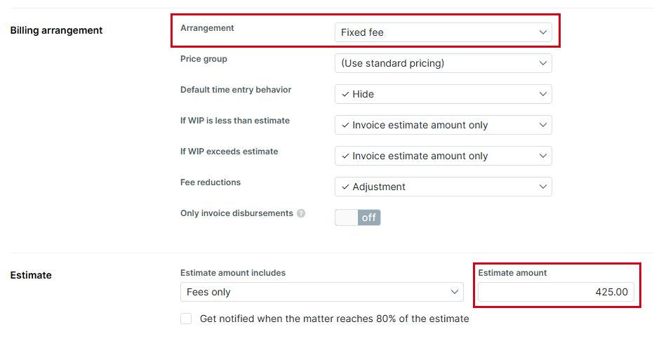 - Make sure Arrangement is set to Fixed fee in the Billing arrangement section.
