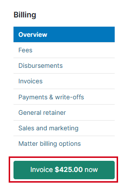 - On the left side of the page, click Matter billing options. The page is updated to show Matter Billing Options.