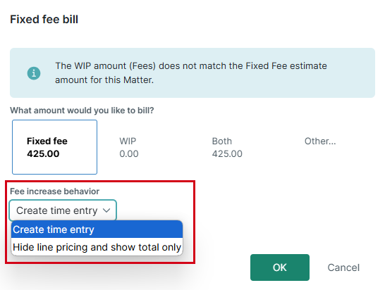 When creating a fixed fee invoice, the Fixed Fee Bill window will be displayed with the following options: