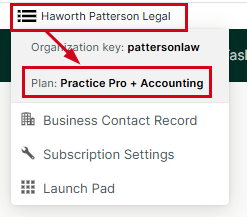 - In Actionstep, hover over the organization menu (located on the top-left corner of any Actionstep page).