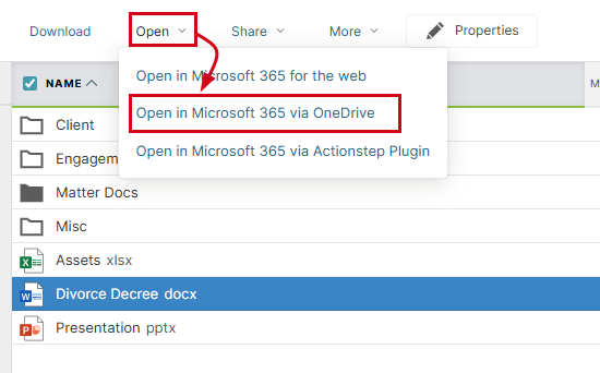 Documents can be opened from Actionstep and edited via Microsoft OneDrive. This connection opens your document in your desktop version of Microsoft 365.