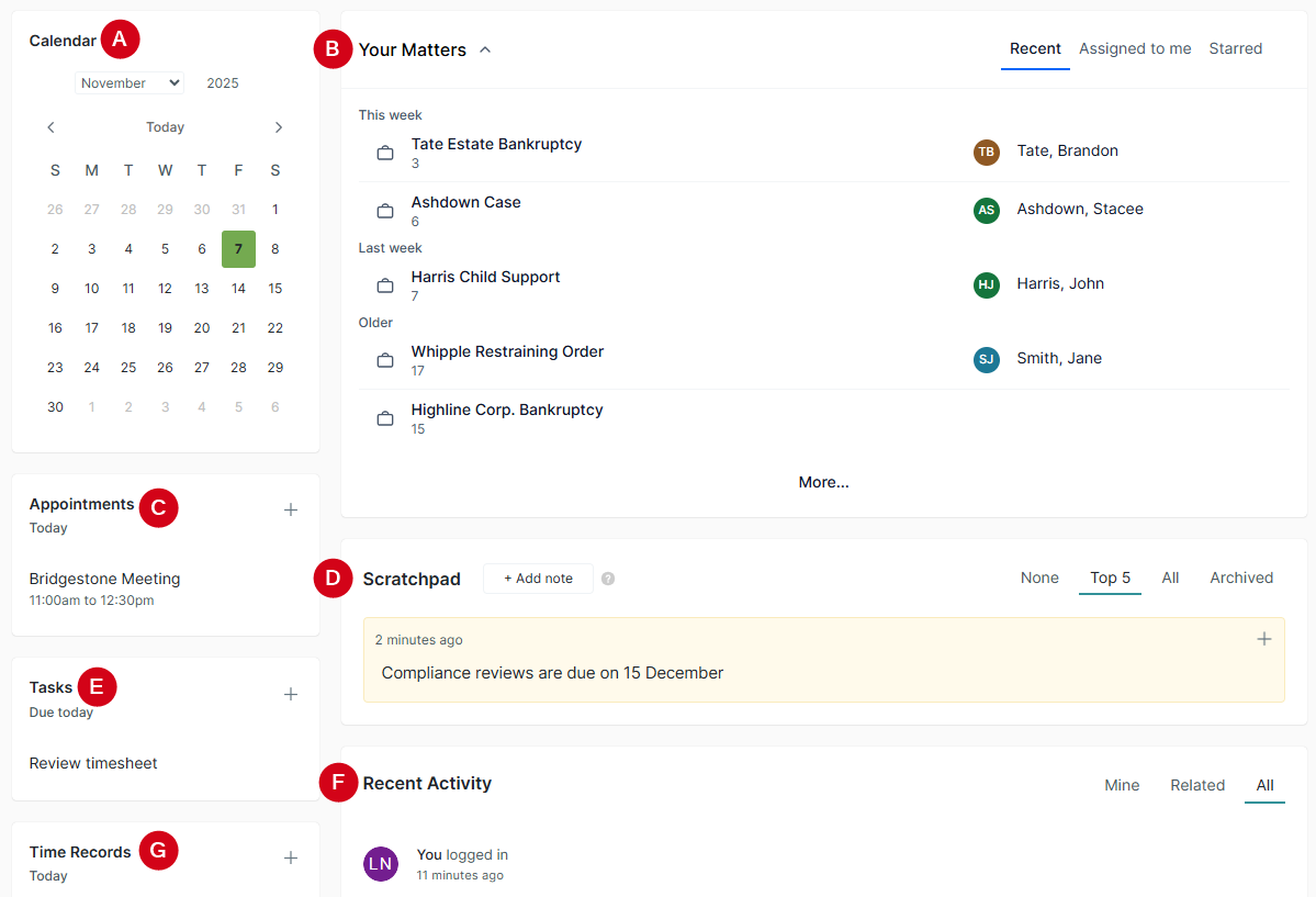 This section shows all the matters that you have accessed recently, any matters that are assigned to you, and any matters you have marked as a favorite.