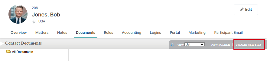 The page is updated to show all of the contact's documents. - Click Upload New File.
