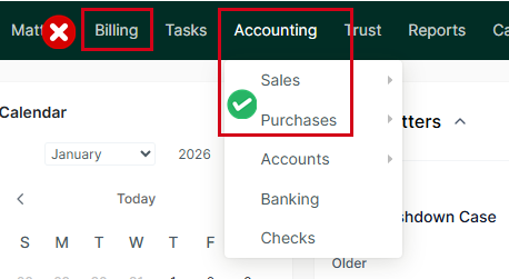 NOTE: Changing the Sale Alias and Purchase Alias wording in the above settings will only change the menu names under the Accounting menu. It will not change the Billing menu or menus under Billing: