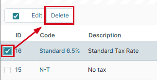 - Select the checkbox next to each tax code you want to delete.