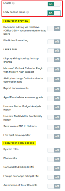 When enabled, the feature preview option allows you to try new features that Actionstep has developed before they are applied to everyone. When enabled, the Early Access Group feature allows you to preview features even earlier while they are still being tested by Actionstep.