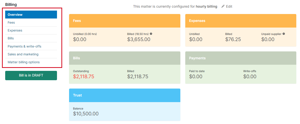 When viewing a matter's Billing page, the left side of the page shows a menu list of options. Some of these can also be permissioned.