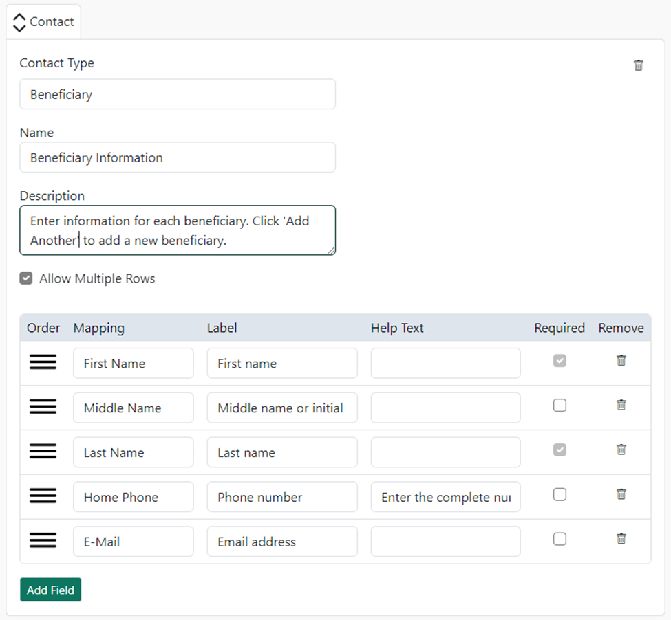 - Select Allow Multiple if you want to allow clients to enter more than one set of answers. For example, if you’re creating a list of beneficiaries, selecting this option lets users enter more than just one. (When you select this option, each participant entered in this section will create a new system contact in Actionstep, as well.)