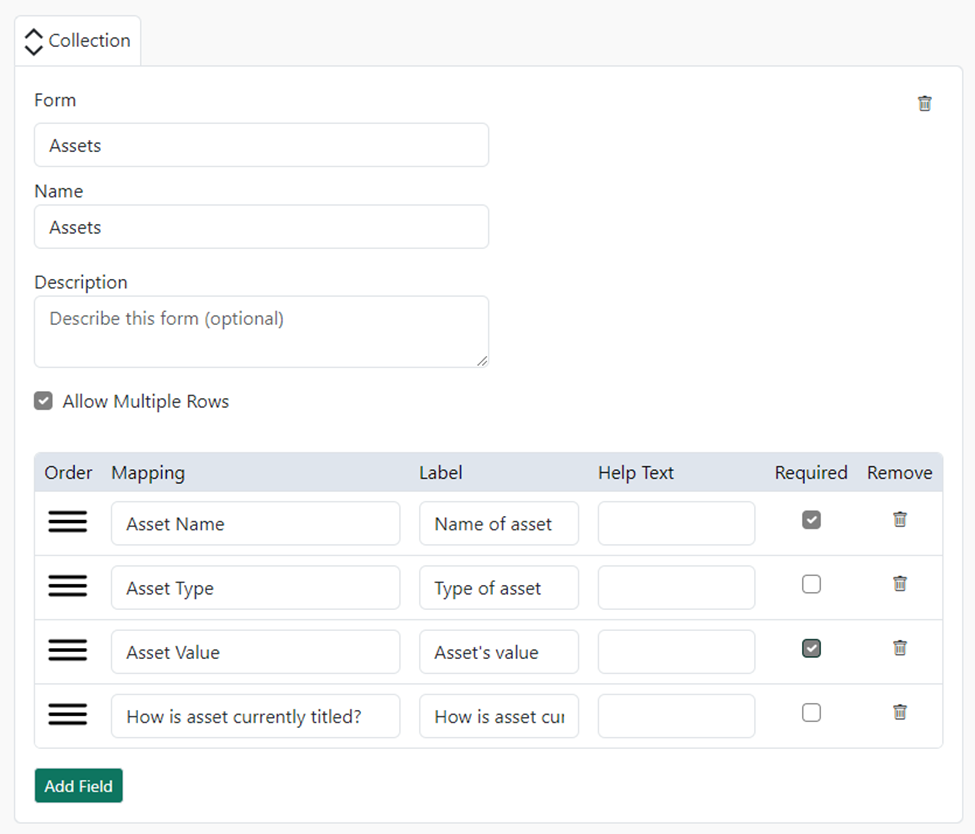- Enter a Name for this section. For example, if you’re asking for information about assets, you might enter Assets.