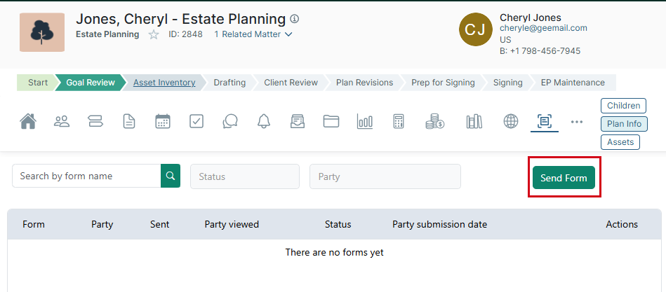 - Ensure the parties you need to share the form with are set up correctly for the matter. This means roles have been identified for the matter, the contact (party) has been added to the matter, and the contact's email address has been entered.