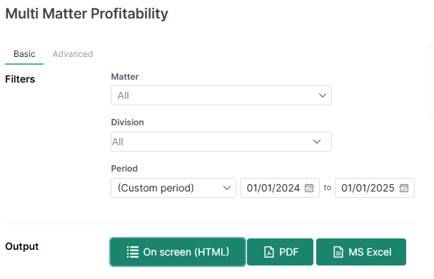 - Choose the filters you want applied. Typically your filters let you choose what data you want included and how you want it organized. Note that most reports using the newer style include both Basic and Advanced filters.