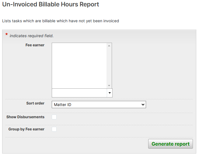 The process for creating a report varies by report. Some reports use a newer-looking workflow, while others workflows are older. All reports include options for customizing the type of data you want included in the report. And depending on the report type, you can print or save the report and optionally associate it with a specific matter.