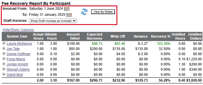 Some reports are built in real-time, meaning as you select your filters, the report is updated directly below the filters. You can use the options associated with the report to change your criteria or refresh the data in the report: