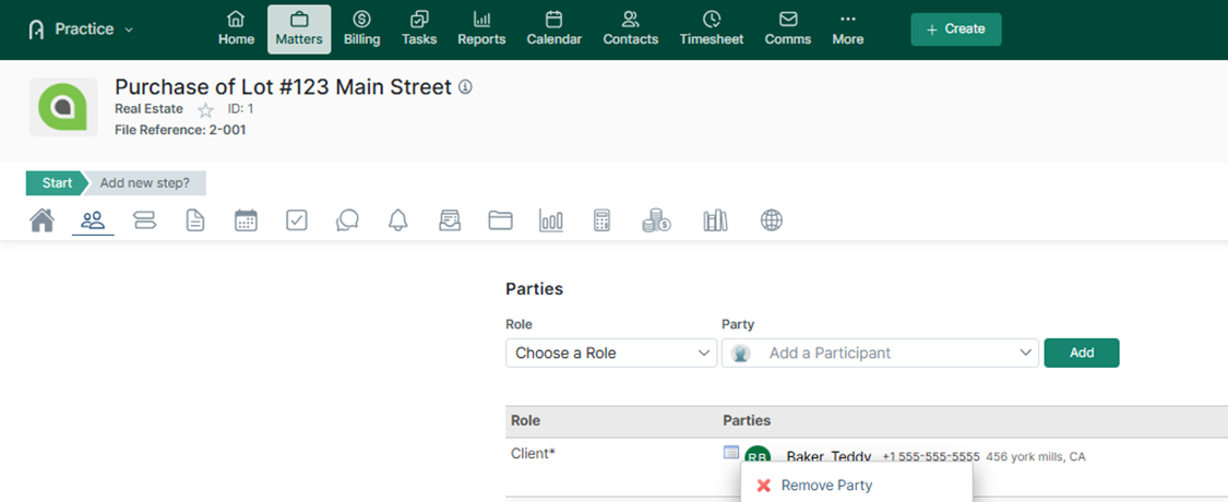 If there are multiple clients on a matter, but an incorrect primary client has been defined, find the matter in Practice Management and use the Remove Party function to remove the client from the matter. Then add the clients back to the matter, starting with the Primary Client as the first one to be added.