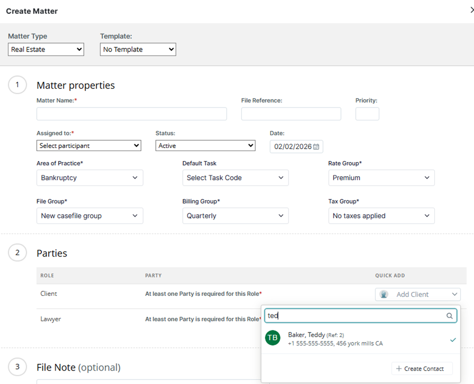 In the Parties section, perform a lookup for the clients you wish to associate with the matter. The first client added to the matter becomes the primary client on file and assumes 100% of the invoice until billing percentages are established for the co-clients in Legal Accounting.