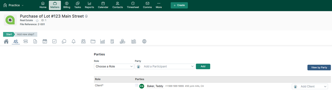 If the matter has already been created, find the matter in Practice Management, go to the Parties Tab and look up or add the additional clients to the matter. The first client added to the matter becomes the primary client on matter and assumes 100% of the invoice until billing percentages are established for the co-clients in Legal Accounting.